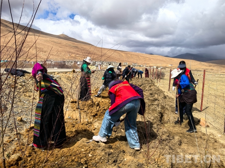 伴隨著一次次鐵鍬鑿擊地表的“嚓嚓”聲、此起彼伏的藏語勞動歌曲和樹苗抖動的“沙沙”聲,一排排規(guī)整的樹坑網(wǎng)格慢慢被鑿出,一棵棵象征希望的樹苗緩緩落下,一抔抔承載著綠色生命的黃土再次埋下,村主干道邊綿延80余米的“綠色生命線”初見雛形,120余棵樹苗挺立村道兩側(cè),以“綠絲帶”串聯(lián)村莊,為春日家園增添盎然生機。