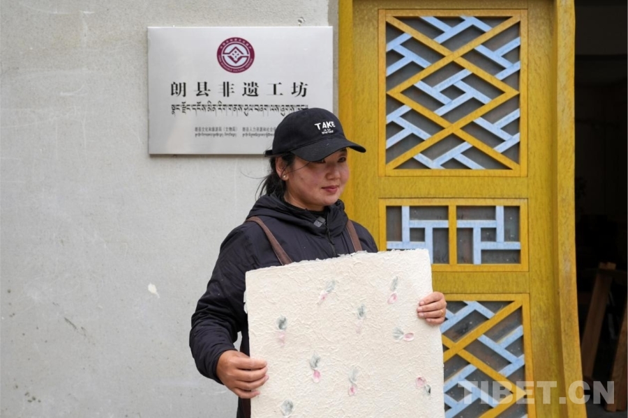 圖為在位于林芝朗縣的非遺工坊前,金東藏紙制造技藝非遺傳承人加里正在展示她制作的鮮花藏紙 攝影:邊子捷