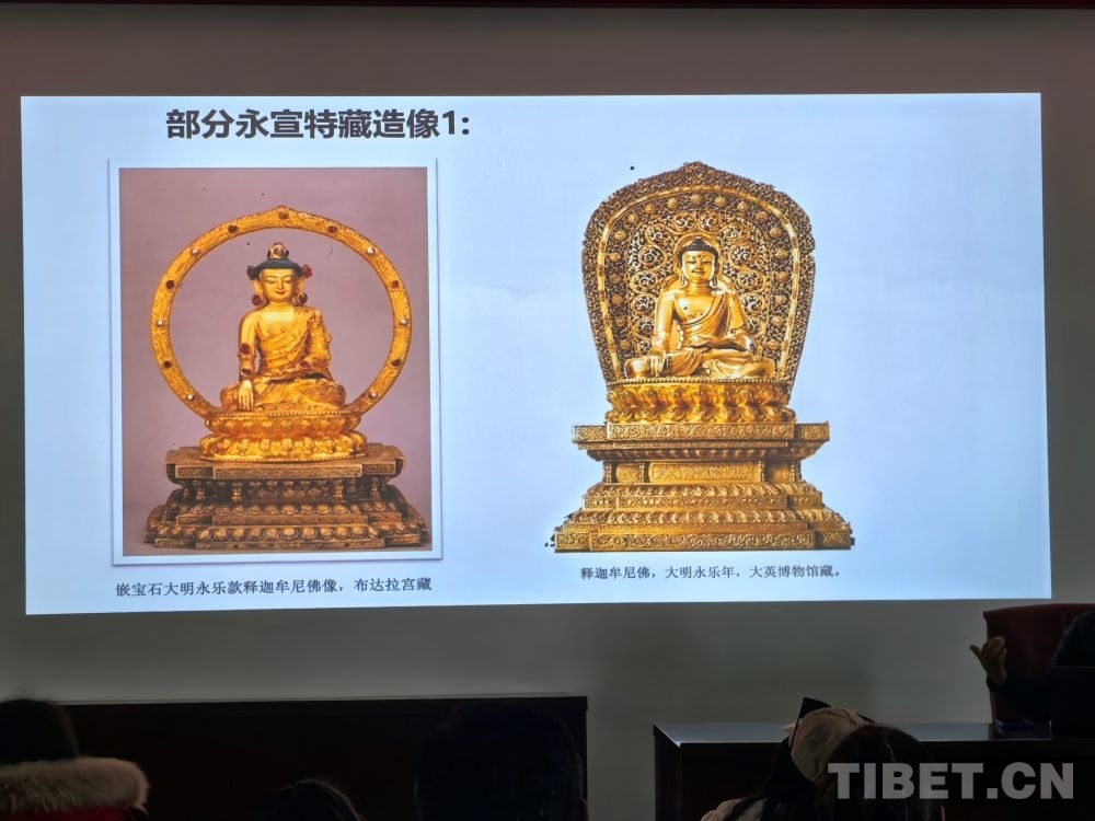班旦次仁在講座中說,長期以來國內(nèi)外學者普遍認為全球永宣造像共有300余尊。但在2013-2017年間的西藏可移動文物普查中,西藏共發(fā)現(xiàn)360尊永宣款造像,僅布達拉宮一處就發(fā)現(xiàn)了273尊,這些永宣造像自17世紀以來就一直供奉在布達拉宮各大殿堂,且鮮有人接近,為漢藏藝術(shù)交融研究提供了核心實物佐證。不僅如此,布達拉宮內(nèi)還有專門的“嘉納拉康”(漢地造像殿)來供奉這些佛像,布達拉宮收藏此類造像居世界之冠。