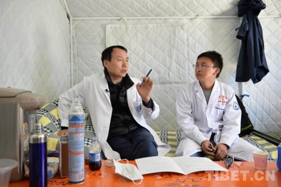 圖為2021年,余震中,王建六(左)帶領(lǐng)團(tuán)隊(duì)赴青海省瑪多縣開展宮頸癌篩查,在帳篷辦公室里與當(dāng)?shù)蒯t(yī)務(wù)工作者交流 北京同心共鑄公益基金會供圖