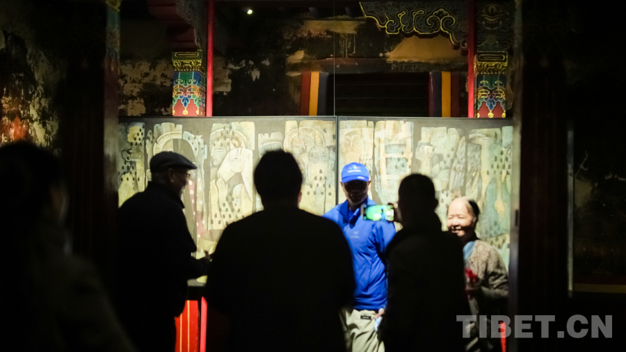 此次展覽中,策展人以“藏地傳統(tǒng)的當(dāng)代轉(zhuǎn)化”為主線,梳理上述不同系列作品,完整呈現(xiàn)出藝術(shù)家的創(chuàng)作脈絡(luò)。展覽標(biāo)題“夢瑜伽”,來自《黑經(jīng)書》系列作品的創(chuàng)作故事,清代壁畫環(huán)繞的獨特古建場域與《黑經(jīng)書》系列作品于光影間輝映,共同營造出西藏藝術(shù)歷史與當(dāng)下交錯的鏡像,在搭建橋梁、連結(jié)傳統(tǒng)與時代精神的同時,也引領(lǐng)觀眾走入高強(qiáng)度的精神性探索。