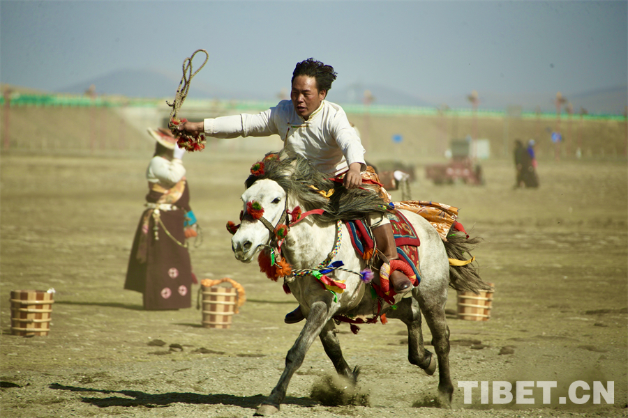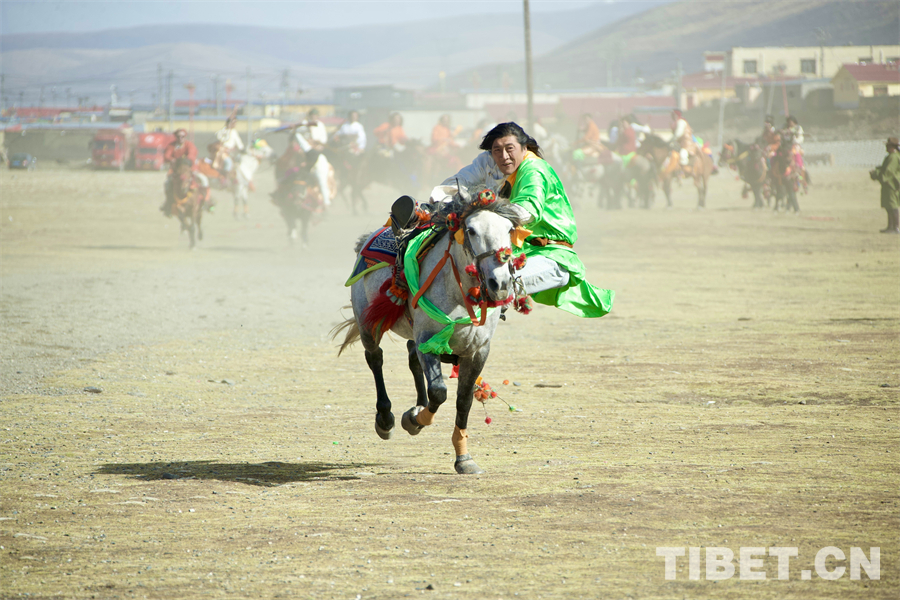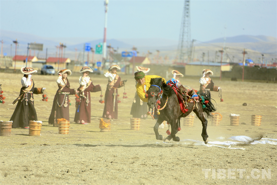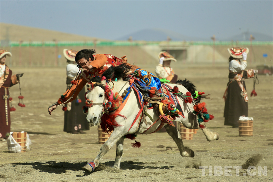 在海拔4000米左右的遼闊天地間,康巴漢子們駕馭著矯健的駿馬、身著華美的傳統(tǒng)服飾,如疾風(fēng)般掠過(guò)金色的草原,在馬背上展示跑馬射箭、乘馬射擊、跑馬拾哈達(dá)、跑馬倒立、跑馬懸體等高難度動(dòng)作,馬蹄聲聲、歡呼陣陣,交織成高原最豪邁的樂(lè)章。(中國(guó)西藏網(wǎng) 記者/畢然 龍真多吉)