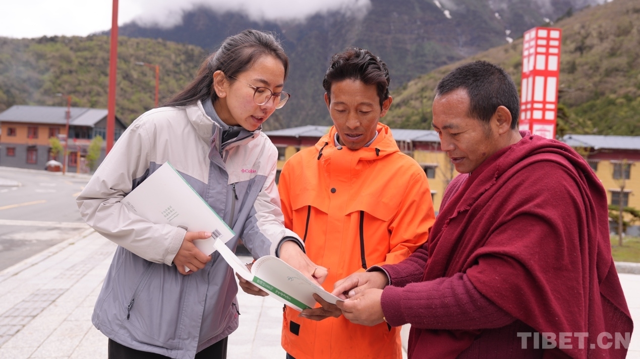 圖為西藏自治區(qū)藏語委辦(編譯局)工作人員為玉麥鄉(xiāng)群眾指導(dǎo)學(xué)習(xí)方法