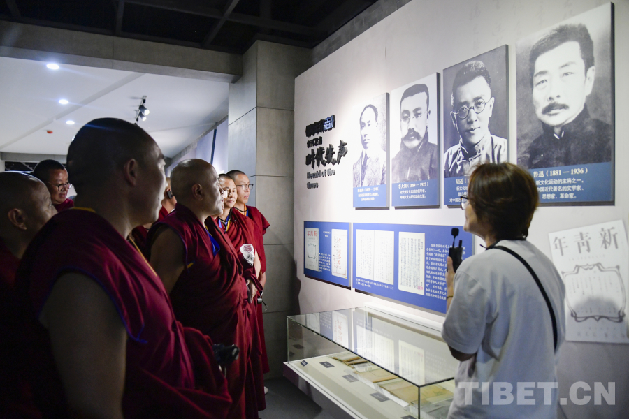 圖為在嘉興五四文化博物館內(nèi)西藏佛學(xué)院師生認真聆聽關(guān)于五四運動的講解 攝影:趙振宇
