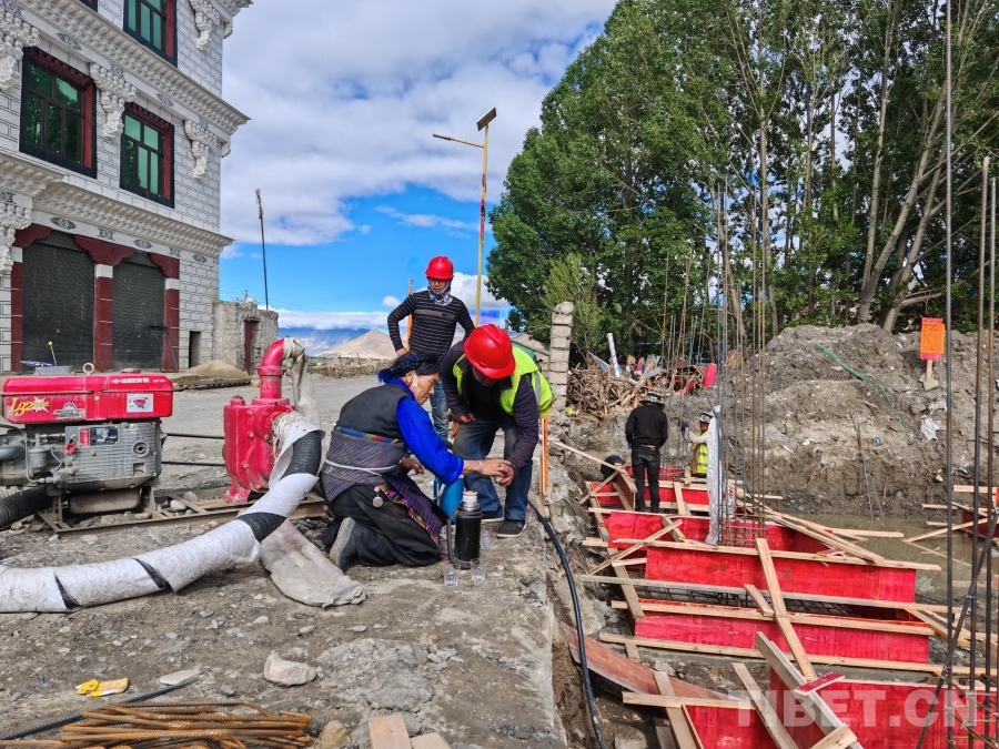 在仲康村巴桑家的重建工地上,工程已進入鋼筋捆扎階段。一場突如其來的夜雨導(dǎo)致基坑積水。清晨七八點,施工隊員已在基坑中忙碌開來,有的加緊捆扎鋼筋,有的尋找水泵抽水。日頭漸高,汗水浸濕了工人們的額頭,他們卻無暇休息。這時,阿媽巴桑提著一壺剛煮好的甜茶走來,就地一杯杯沏好,熱情地招呼這群“小伙子”。“以前的老房子震壞了,現(xiàn)在黨和政府給我們建更好的新房子,日子肯定越過越有盼頭!”樸實的話語里,滿是她對未來的憧憬和對援助的感激。
