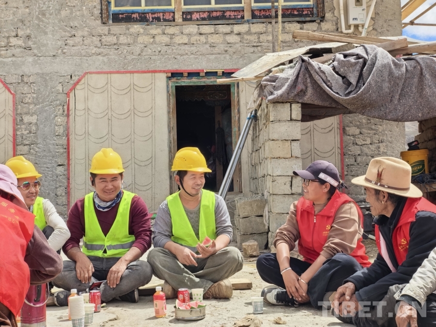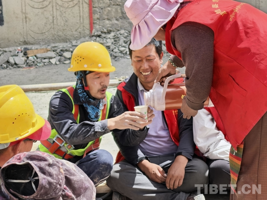 負(fù)責(zé)白瑪村重建的四標(biāo)段施工隊,隊員來自五湖四海。來自山西五臺山的建筑工人張計平喝完酥油茶感慨道:“這茶咸中帶甜,干完活喝下去特別解乏提勁!老鄉(xiāng)們太熱情淳樸了,讓我們干活都更有勁兒!”一旁的安全員陳灝吃著西瓜補充道:“我們一定爭取早日讓鄉(xiāng)親們住進安全舒適的新家!”