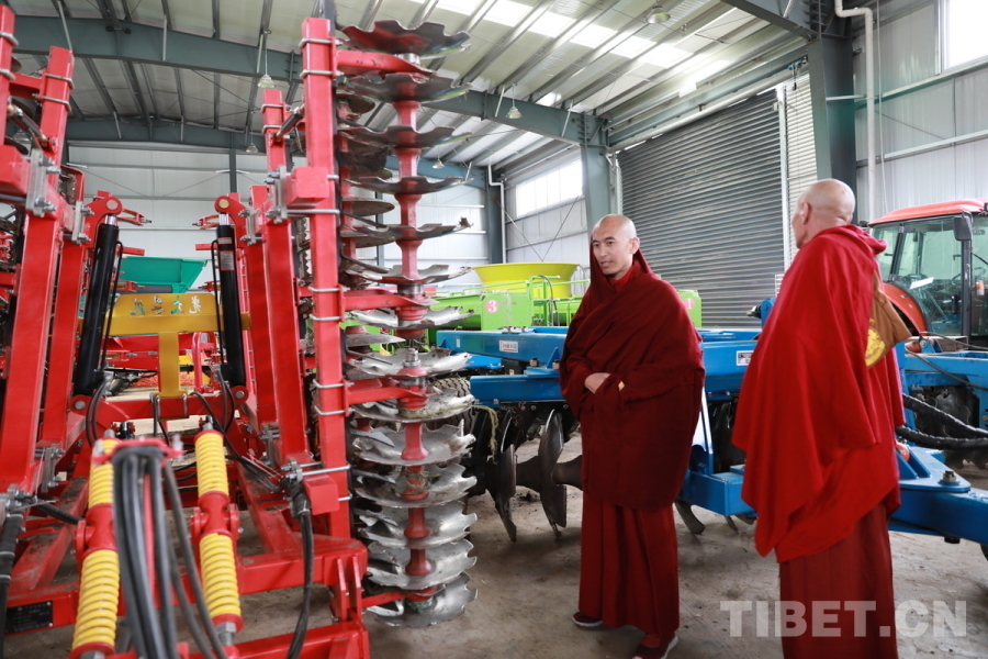 圖為甘孜縣甘孜寺的僧人江陽克珠(左)正在觀察大型現(xiàn)代化農(nóng)業(yè)機械 攝影:劉莉