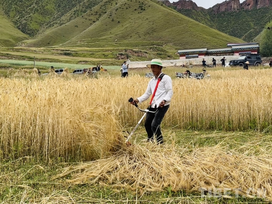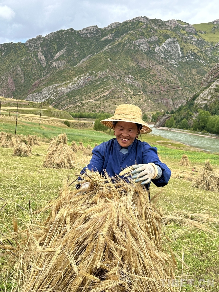 眼下,飽滿的青稞穗隨風(fēng)搖曳,村民們熟練地彎腰、揮鐮、捆扎,田間地頭呈現(xiàn)出一派繁忙景象。“今年雨水好,青稞長(zhǎng)得也比往年好?!币晃淮迕褚贿呅χ?,一邊向我們展示剛剛捆好的青稞麥堆。