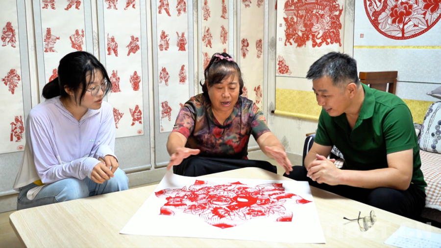 圖為齊秀花介紹剪紙作品《和美西藏?同心共慶》