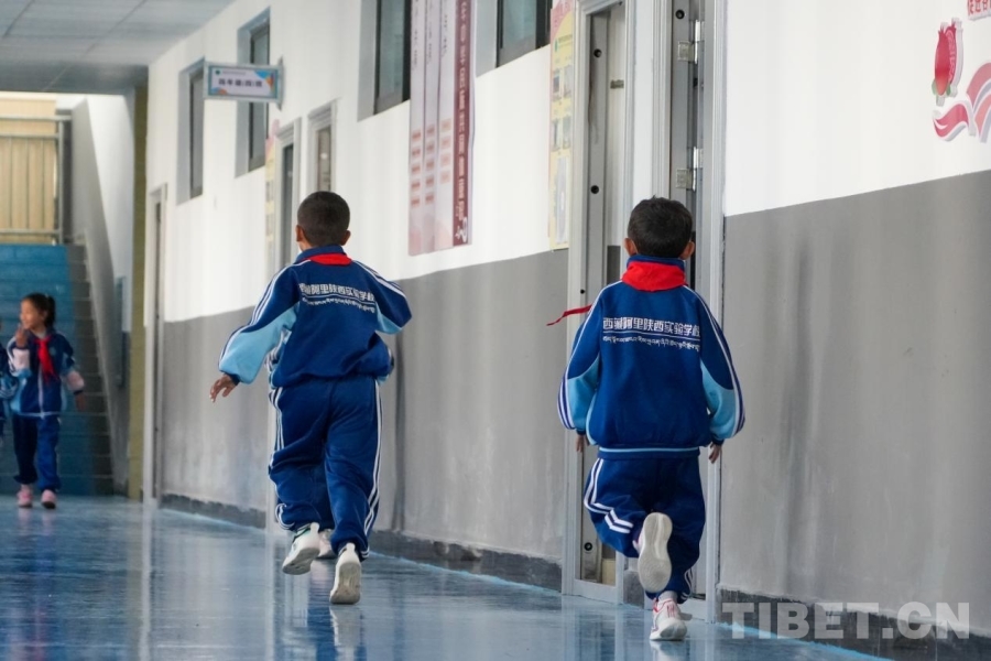 圖為在西藏阿里陜西實(shí)驗(yàn)學(xué)校,孩子們在干凈的走廊內(nèi)嬉戲 攝影:邊子捷