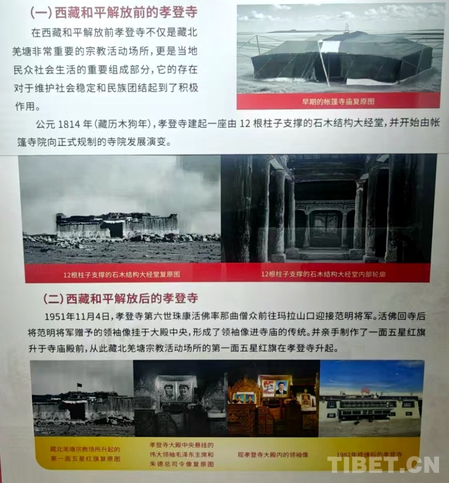走進(jìn)孝登寺,主殿正中央懸掛的領(lǐng)袖像莊嚴(yán)醒目。據(jù)孝登寺管委會副書記、主任羅布旺秋介紹,1951年,范明將軍率解放軍途經(jīng)那曲時,六世珠康活佛力排眾議前往馬拉山迎接。范明將軍向僧眾宣講黨的民族宗教政策,并向六世珠康活佛贈送了毛主席和朱總司令畫像。此后,六世珠康活佛將領(lǐng)袖像敬懸于大殿正中,這一傳統(tǒng)延續(xù)至今。他還親手制作并升起了藏北寺廟中的第一面五星紅旗。