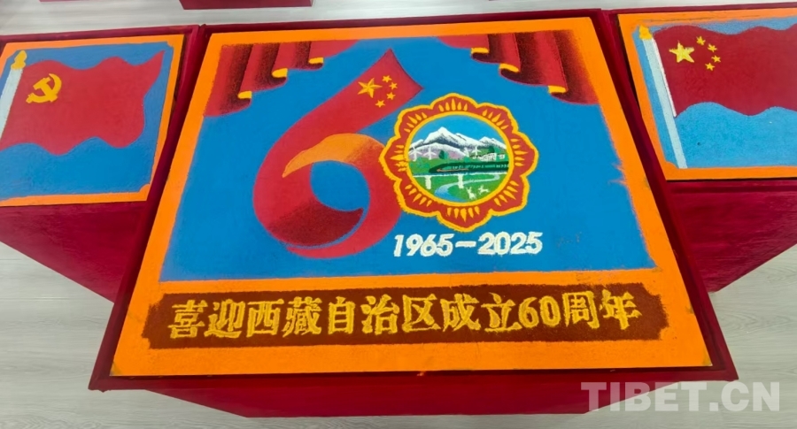 圖為孝登寺鑄牢中華民族共同體意識展覽館內(nèi),該寺僧人特別為西藏自治區(qū)成立60周年精心自制的沙畫