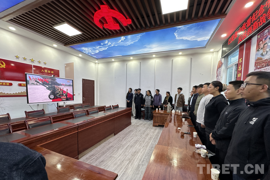 圖為日喀則邊境管理支隊(duì)下亞?wèn)|邊境派出所龐達(dá)警務(wù)室和鄉(xiāng)政府的工作人員共同觀看紀(jì)念中國(guó)人民抗日戰(zhàn)爭(zhēng)暨世界反法西斯戰(zhàn)爭(zhēng)勝利80周年大會(huì) 攝影:王楠