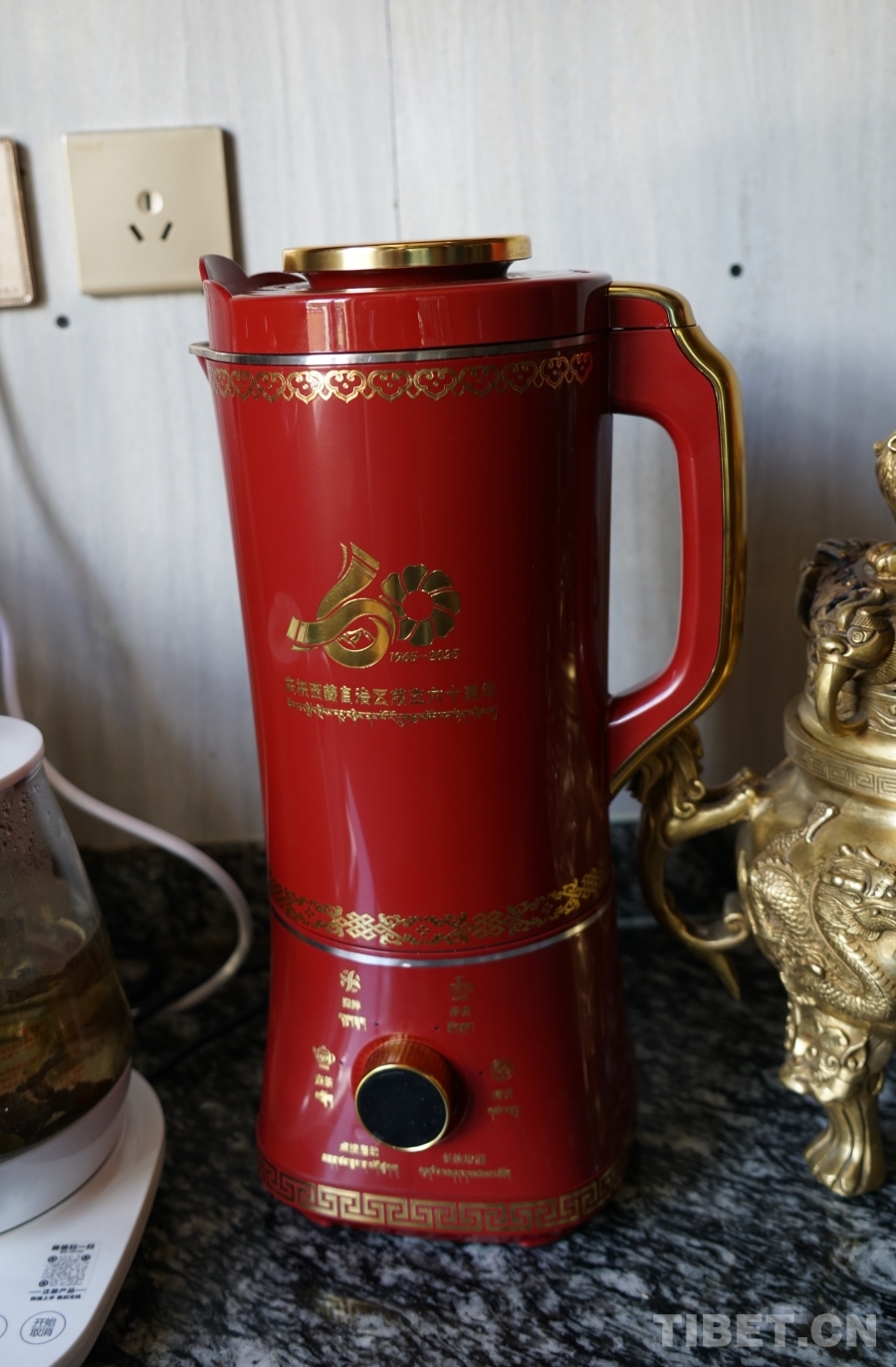 走進(jìn)客廳,茶幾上擺放著一臺(tái)紅色嶄新的全自動(dòng)酥油茶壺,機(jī)身上鐫刻著“慶祝西藏自治區(qū)成立60周年”的字樣。另一旁的展柜上,一套鎏金茶碗嶄新如初,仿佛能映出人影——那是2015年中央代表團(tuán)贈(zèng)送的西藏自治區(qū)成立50周年禮物。這些細(xì)節(jié),無(wú)不透露出主人對(duì)它的珍視。