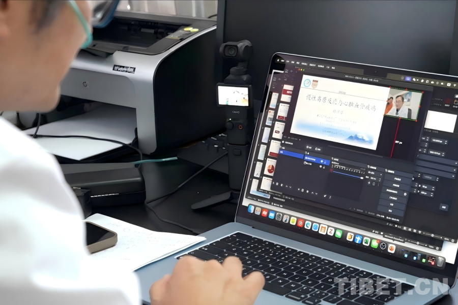 在阿里地區(qū)人民醫(yī)院的行政樓辦公室內(nèi),來自上海華山醫(yī)院神經(jīng)外科、作為第25批“博士服務(wù)團”成員援藏的主治醫(yī)師杜倬嬰,正專注研究一項“新技術(shù)”。桌面上,一臺口袋相機運行著,旁邊電腦屏幕上同步顯示相機所拍攝的畫面,同時呈現(xiàn)的還有一份關(guān)于高原反應(yīng)與心腦血管疾病的課程講義?!斑@是一套直播系統(tǒng),不過我現(xiàn)在還在學(xué)習(xí)怎么使用?!爆F(xiàn)任阿里地區(qū)人民醫(yī)院黨委委員、副院長的杜倬嬰笑著展示初見雛形的成果。