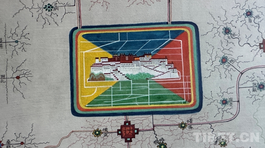 作為一件與地圖密切相關(guān)的作品,達(dá)布主要依據(jù)公路主線和國(guó)家公布的行政區(qū)域進(jìn)行描繪,對(duì)于一些在常用地圖上無法精確定位的地名,采取了審慎態(tài)度。達(dá)布還追溯了西藏的地圖繪制傳統(tǒng),認(rèn)為可以從著名的《西藏鎮(zhèn)魔圖》開始算起。然而,創(chuàng)作中的挑戰(zhàn)并沒有阻礙他的創(chuàng)作熱情。“畫著這幅畫,我覺得這是一個(gè)普通唐卡畫師用畫筆感恩當(dāng)下,是對(duì)歷史的真實(shí)記錄,對(duì)偉大工程成果的贊揚(yáng),也是對(duì)傳統(tǒng)唐卡表現(xiàn)形式的突破和思考。”