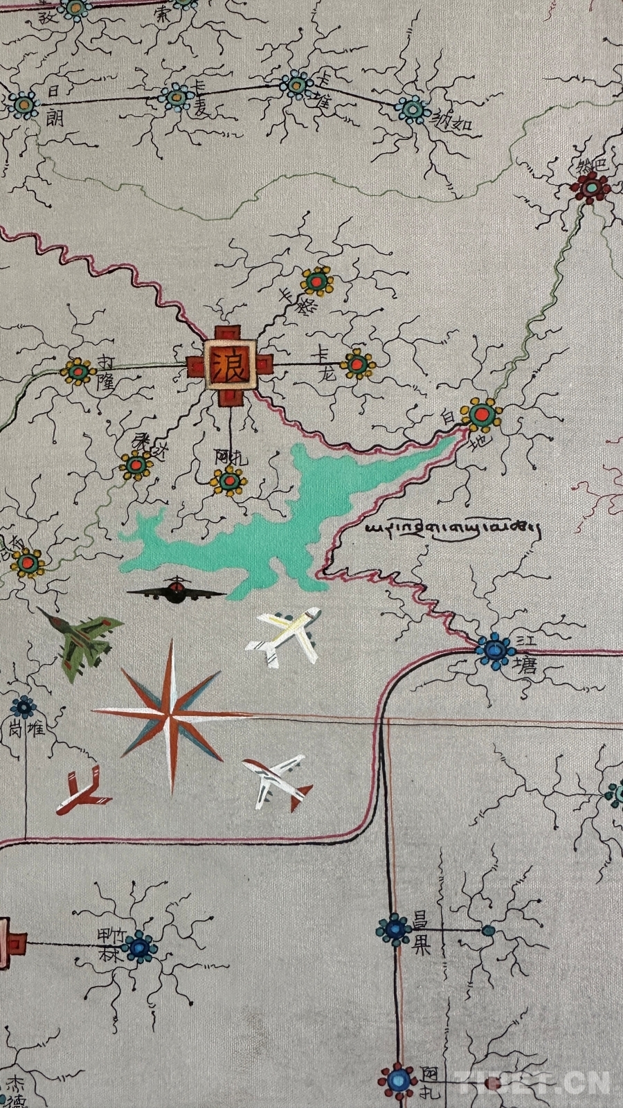 達(dá)布詳細(xì)解釋了這幅唐卡的圖像系統(tǒng):正方形代表市、區(qū),內(nèi)部畫有該市區(qū)主干道地圖;十字方形代表縣;圓形寶石形代表鄉(xiāng)鎮(zhèn);藏文“嗡”字代表名勝古跡;此唐卡以黑線為所有公路基礎(chǔ)線,黑線邊上的紅黃線代表國(guó)道和高速,綠線代表省道,黑細(xì)線代表縣鄉(xiāng)鎮(zhèn)及村級(jí)公路。沿途還繪制了珠峰、古格王國(guó)遺址、納木錯(cuò)等代表性景點(diǎn),并用藏文標(biāo)注名稱。