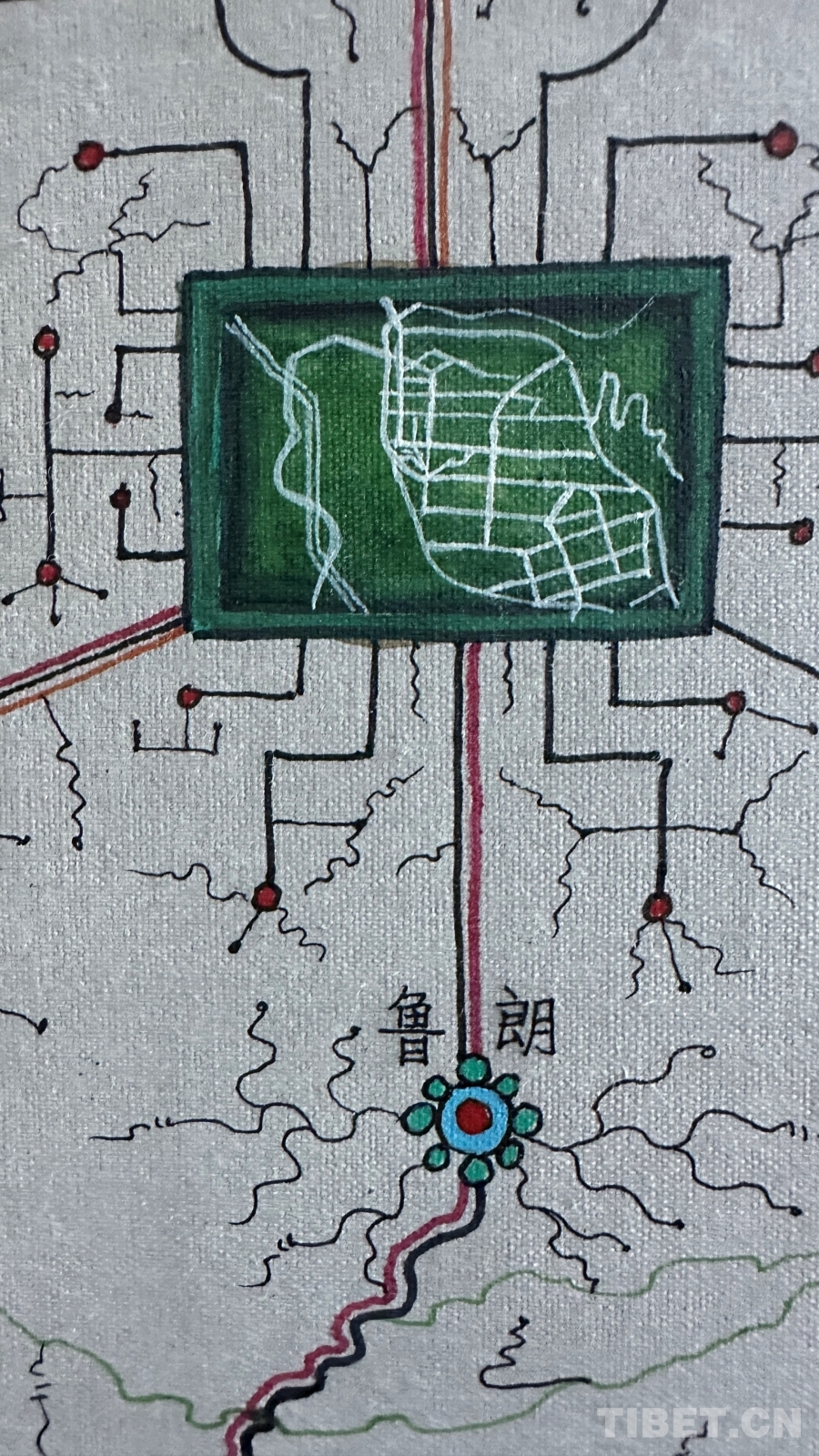 創(chuàng)作過程中最大的困難是如何藝術(shù)地表現(xiàn)公路網(wǎng)絡(luò)?!拔彝ㄟ^分析現(xiàn)代地圖、衛(wèi)星導(dǎo)航、古代寶藏圖和手繪地圖,發(fā)現(xiàn)西藏公路是順應(yīng)地貌修建的?!边_(dá)布描述著他的發(fā)現(xiàn),“沿著河流,一條河有幾個(gè)分支就有幾條路;沿著山谷,一個(gè)大山谷有幾個(gè)小山溝就有幾條路。俯看就像一棵大樹,又像是電腦芯片,一條主干道邊上分出無數(shù)支線。”