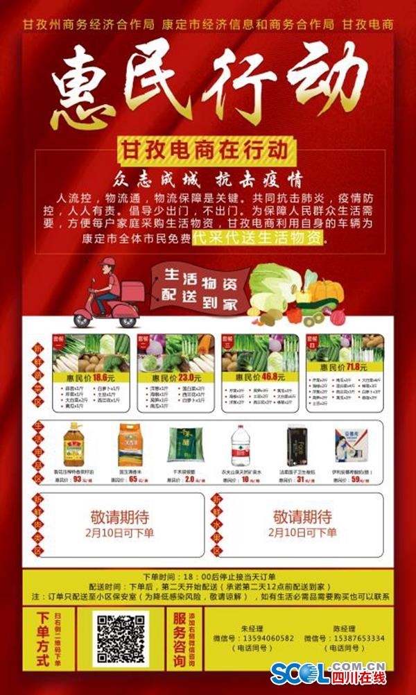 據(jù)悉,這是四川省甘孜州商務和經(jīng)濟合作局為配合防疫工作,降低市民出行交叉感染的幾率,聯(lián)合康定市經(jīng)合局、爐城和榆林2個街道辦9個社區(qū)、圣潔甘孜扶貧超市、康定民貿公司、康定鄰你超市、順豐甘孜快遞等企業(yè)和單位,為居住在康定新老城區(qū)的居民,專門開展的“防疫套餐”送貨上門惠民行動。