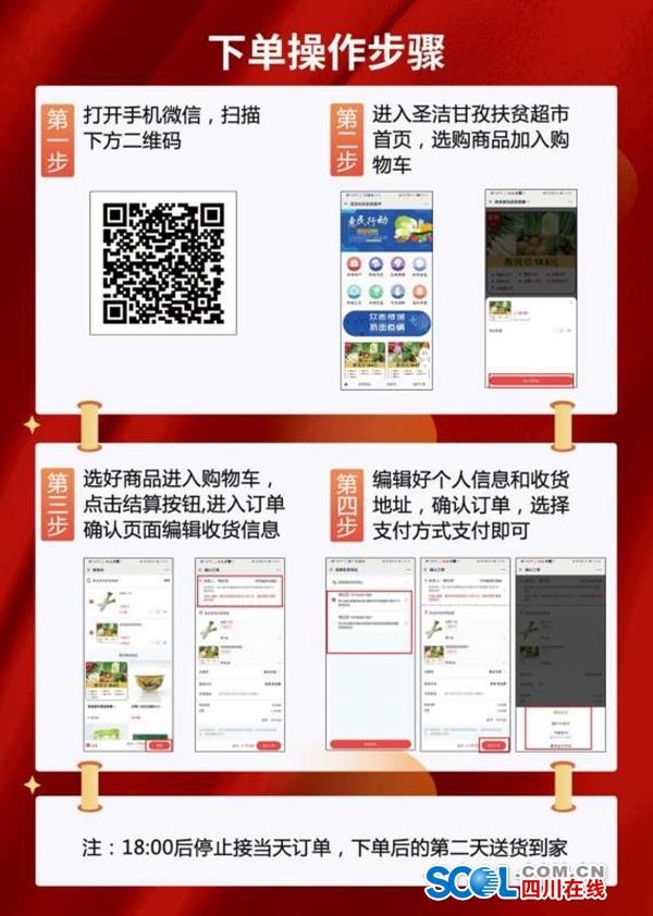“防疫套餐”送貨上門惠民行動從2月9日開始試運行,2月10日第一批蔬菜貨物正式送到家。家住在康定市新老城區(qū)的市民,只需通過掃描電子宣傳單的二維碼,進入圣潔甘孜扶貧超市首頁,選購商品加入購物車,點擊結算,進入訂單確認頁面編輯收貨信息,之后確認訂單選擇支付方式支付即可。當天下單,最遲第二天就能在家免費收貨。
