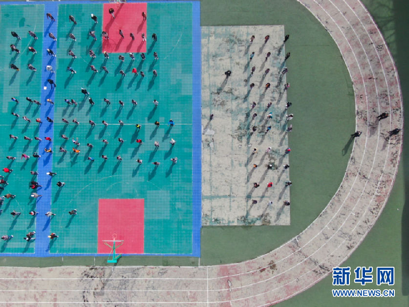 在青海省玉樹藏族自治州八一孤兒學校,學生們在進行課間活動(4月3日攝,無人機照片)。新華社記者 張龍 攝