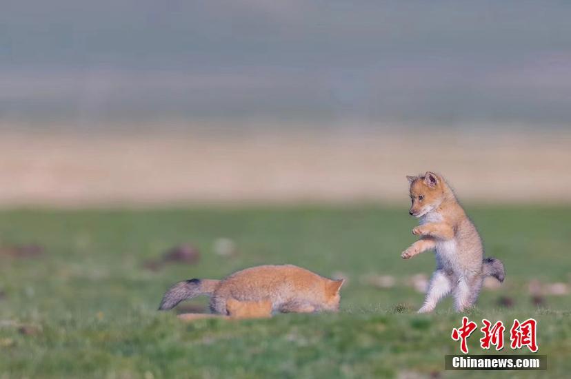 圖為狐貍媽媽與小狐貍在草原上嬉戲?!≮w時(shí)春 攝
