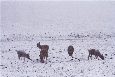 下午6時35分,該地突降大雪,記者在守候了1小時2分后,23只前往卓乃湖產(chǎn)仔的藏羚羊,在五道梁保護站民警雙向禁停車輛的守護下,均平安通過青藏公路。