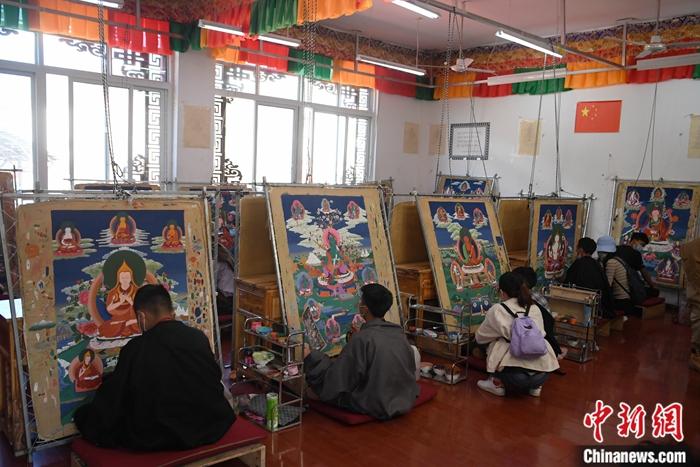 6月中旬,唐卡畫技能班里的學(xué)生們正在完成自己的畢業(yè)作品。中新社記者 劉忠俊 攝