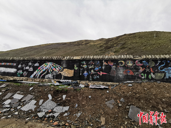 學(xué)校里有一面墻,現(xiàn)代文明的痕跡與傳統(tǒng)游牧的習(xí)俗,被學(xué)生們畫在了一起。畫上有五彩經(jīng)幡、雪山羊群,有絢麗的格?;ê蜏嘏臍址?,以及穿著藏袍大笑的孩子。畫上還有直升飛機(jī)、火箭和飛碟。