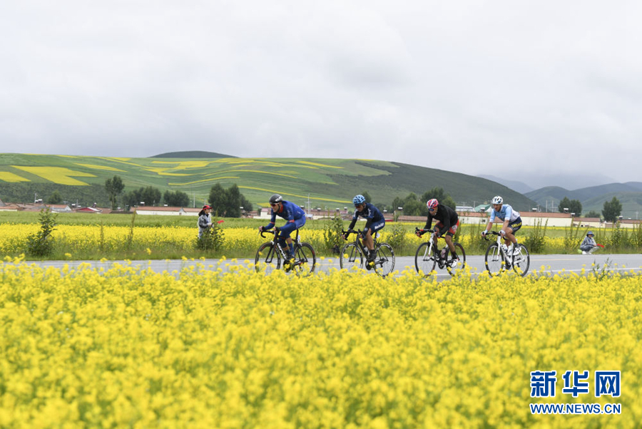 2019年7月21日,車手們?cè)诒荣愔序T行。當(dāng)日,第十八屆環(huán)青海湖國(guó)際公路自行車賽展開第八賽段——西海鎮(zhèn)到青石嘴的角逐。新華社 張龍 攝