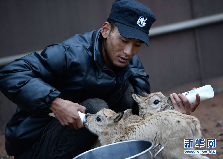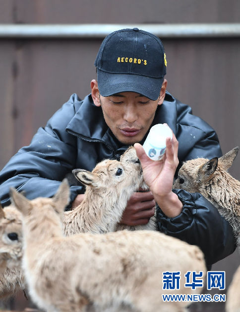 7月7日,三江源國家公園管理局長江源園區(qū)可可西里管理處卓乃湖保護(hù)站的工作人員才文多杰在給藏羚羊幼仔喂奶。新華社記者 薛玉斌攝