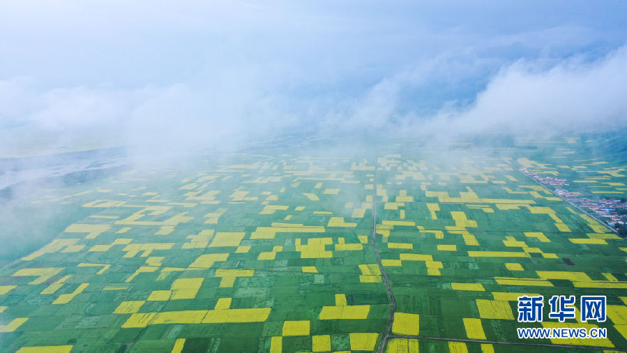 這是7月23日拍攝的門源回族自治縣境內(nèi)的油菜花(無人機(jī)照片)。新華社記者 吳剛 攝
