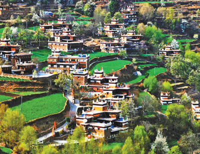 相對(duì)高差近千米的山坡上,一幢幢藏式樓房分布在綠樹叢中,陽光從云的縫隙間投射在山坡上,錯(cuò)落有致,恬靜安寧。