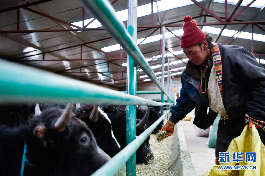 青海省黃南藏族自治州澤庫縣寧秀鄉(xiāng)拉格日村牧民多杰才旦在合作社的牛棚里喂牛(2019年1月17日攝)。新華社記者 張龍 攝