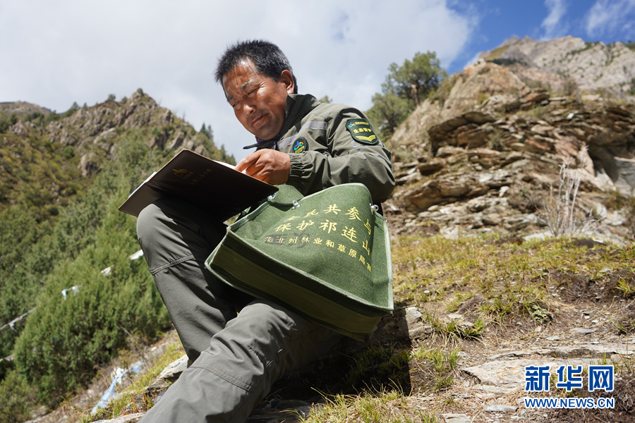 祁連山國家公園青海片區(qū)油葫蘆管護站的生態(tài)管護員王學(xué)清在記錄巡山情況(9月9日攝)。新華社記者 藍(lán)翔 攝