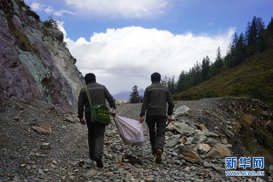 祁連山國家公園青海片區(qū)油葫蘆管護站的生態(tài)管護員在撿拾垃圾(9月9日攝)。新華社記者 藍(lán)翔 攝