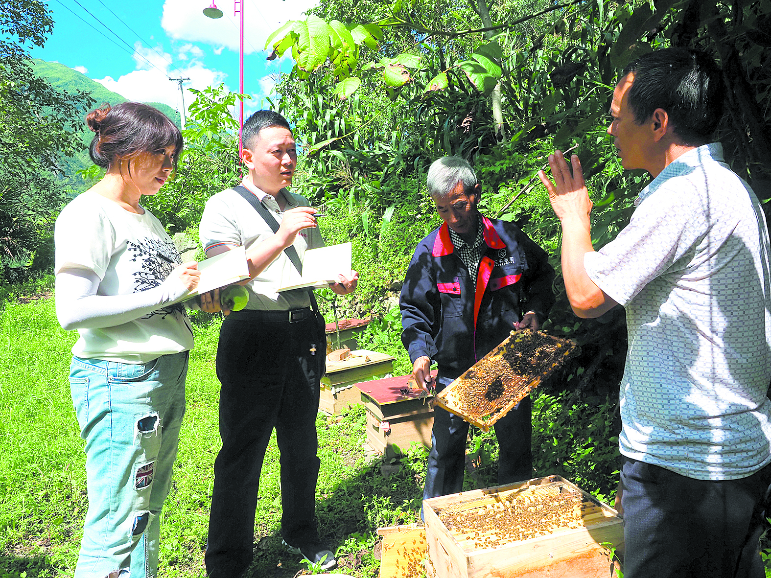 回轉(zhuǎn)身去,蒲江縣對口援助瀘定工作隊隊長吳孟賢正和張洪彬攀談著今年的蜜蜂增收情況?!捌呀h新增財政幫扶資金277萬元作為獎補資金,激勵成都三千米甜蜂業(yè)有限公司落戶瀘定發(fā)展的‘貢嘎中蜂’養(yǎng)殖支援項目,現(xiàn)在已經(jīng)累計發(fā)放貢嘎中蜂7500余群,幫助全縣38個貧困村發(fā)展村級集體經(jīng)濟,示范帶動800戶以上貧困戶增收?!眳敲腺t滔滔不絕如數(shù)家珍,身旁飛過的貢嘎中蜂也似乎成了他和其他對口支援隊員的化身,他們從舒適的成都平原來到高原瀘定,懷揣堅定的信念,用行動肩負起責任與擔當,他們將藏族同胞的利益裝在心里、舉過頭頂,排除千難萬險,因地制宜推動當?shù)匕l(fā)展;跋山涉水,進居入戶,訪貧問苦,為藏族同胞送上溫暖與關(guān)懷……他們用心血和汗水書寫著一個大大的“愛”字,甜到藏族同胞的心坎上。