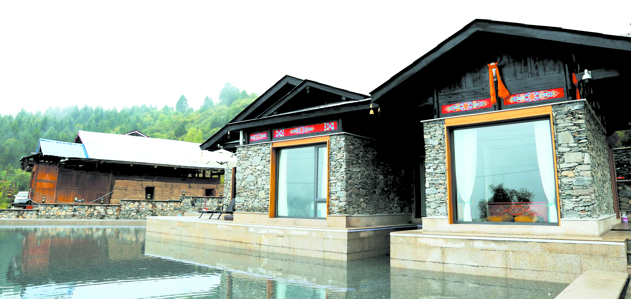往前方望去,山勢起伏,云海翻卷,氣象萬千;往身后看,現(xiàn)代氣息的落地窗與石條砌墻灰瓦覆頂,結(jié)合藏式文化元素的新藏寨,在屋前環(huán)繞的水面倒映下,一個未來網(wǎng)紅打卡地呼之欲出。