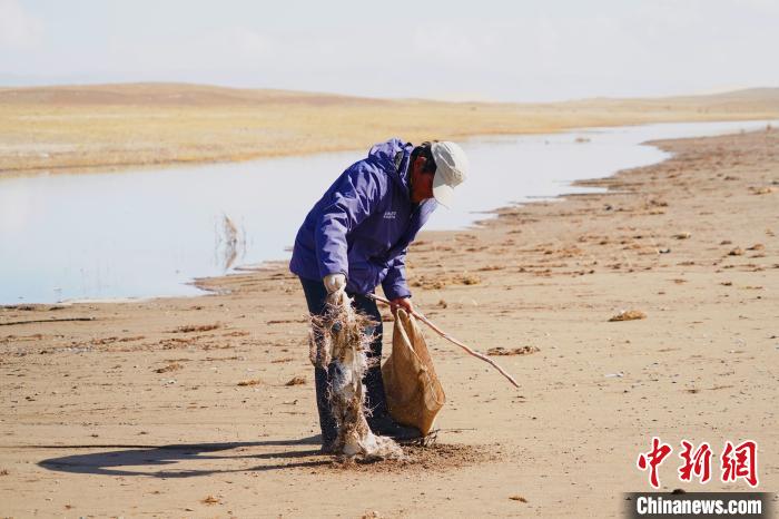 寒風(fēng)凜冽,湖水冰涼,寒徹入骨。十月中旬的青海湖湖濱地區(qū)最低氣溫達(dá)零下二攝氏度,部分河流開始結(jié)冰,青海湖牧民巡護(hù)隊隊員尖木措卷起褲腿,邁入冰冷的湖水,徒手將陷入淤泥中的廢棄鐵絲拉上岸。幾分鐘后,尖木措裸露在外的小腿早已凍得通紅。