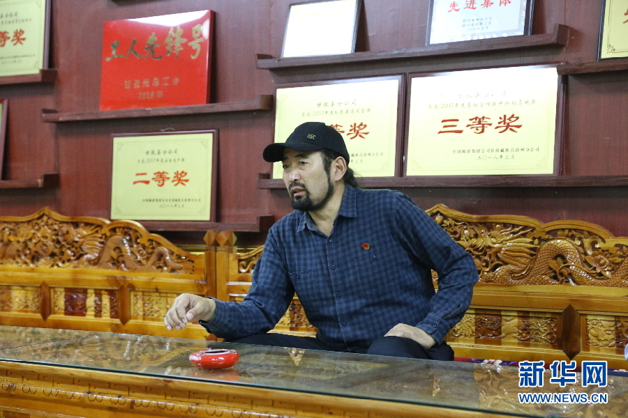 其美多吉接受采訪,背后的墻上掛滿(mǎn)他和集體的各項(xiàng)榮譽(yù)。新華網(wǎng) 曹鵬 攝