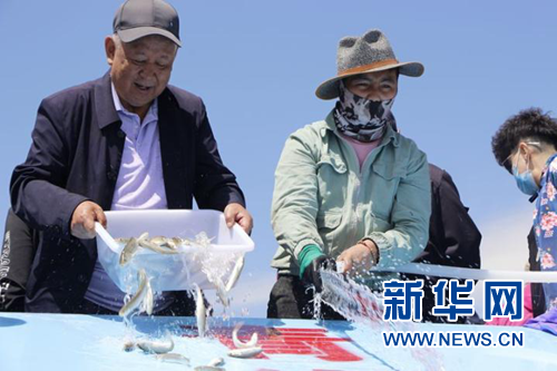 6月6日,當(dāng)?shù)厝罕妼⑶嗪:沲庺~(yú)苗投放到布哈河。新華社記者 周喆 攝