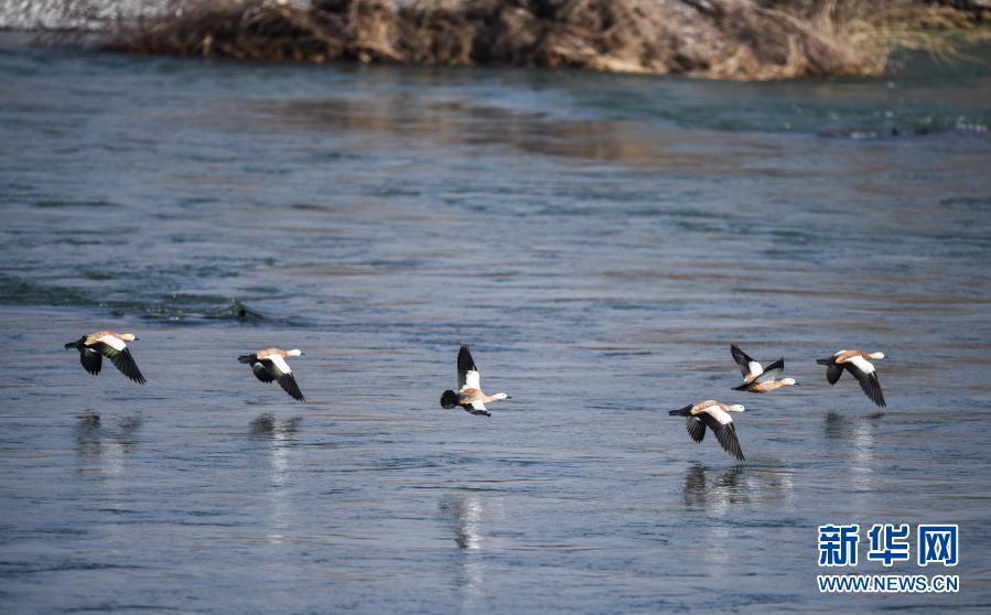 12月11日,赤麻鴨在千姿湖濕地公園飛翔。新華社記者 吳剛 攝