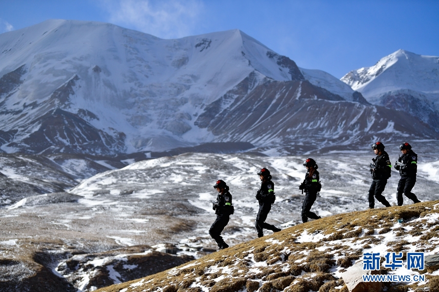 1月9日,青海省果洛藏族自治州公安局特警支隊(duì)直屬女子中隊(duì)的隊(duì)員們?cè)诎⒛岈斍渖侥_下參加高原野外適應(yīng)性訓(xùn)練。新華社記者 張龍 攝