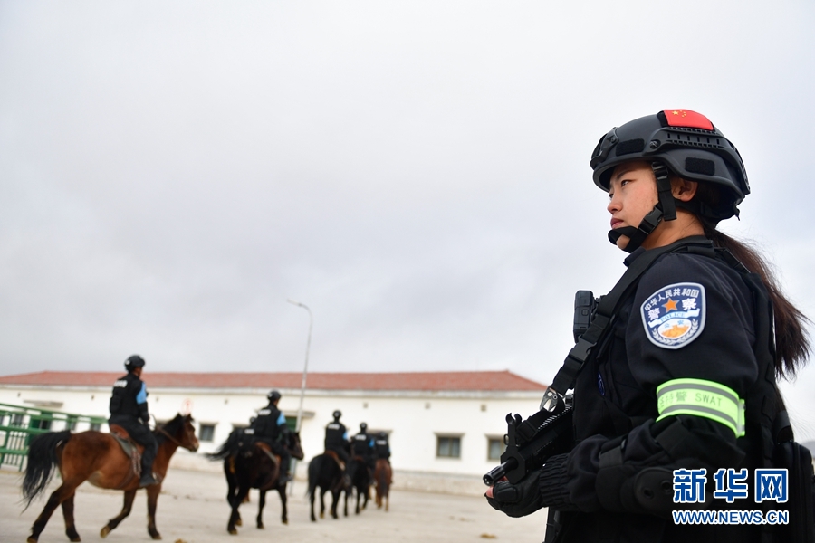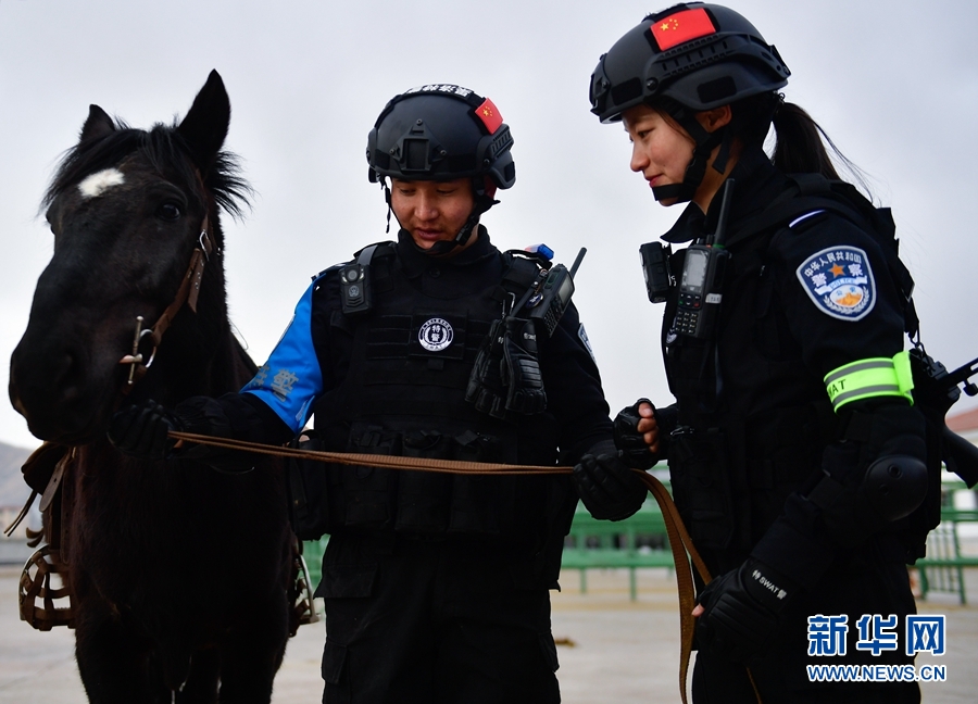 1月9日,青海省果洛藏族自治州公安局特警支隊(duì)直屬女子中隊(duì)的隊(duì)員進(jìn)行騎馬執(zhí)勤訓(xùn)練。新華社記者 張龍 攝