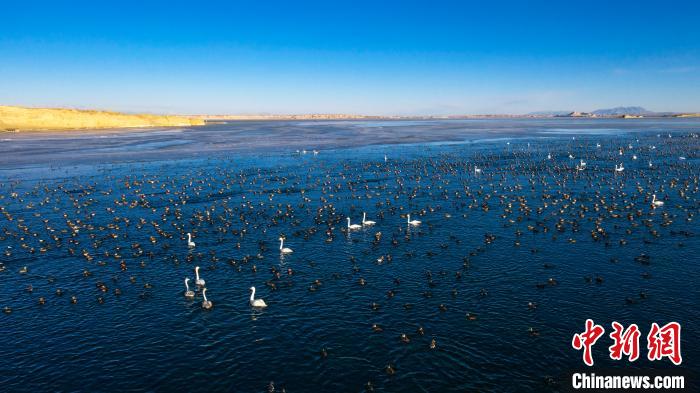 圖為上萬(wàn)只野生鳥(niǎo)類(lèi)在湖中游蕩。烏席勒 攝