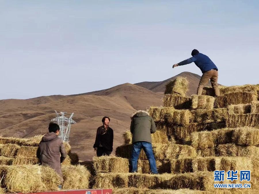 青海省果洛藏族自治州瑪沁縣的牧民在搬運(yùn)飼草料(1月21日攝)。新華社發(fā)