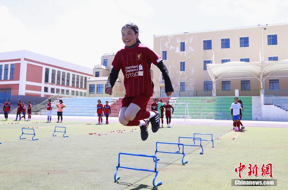 青海湖民族寄宿制學校的足球場上,女子足球隊的隊員們正在進行跑步熱身。中新社記者 馬銘言 攝