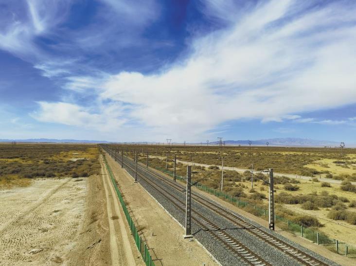 鐵路兩旁的綠化帶一直向戈壁內(nèi)延伸。劉法營 攝