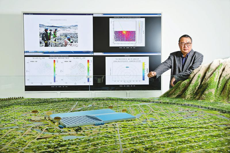 曹臻在高海拔宇宙線觀測(cè)站沙盤(pán)前留影(2021年2月23日攝)。新華社記者 金立旺 攝