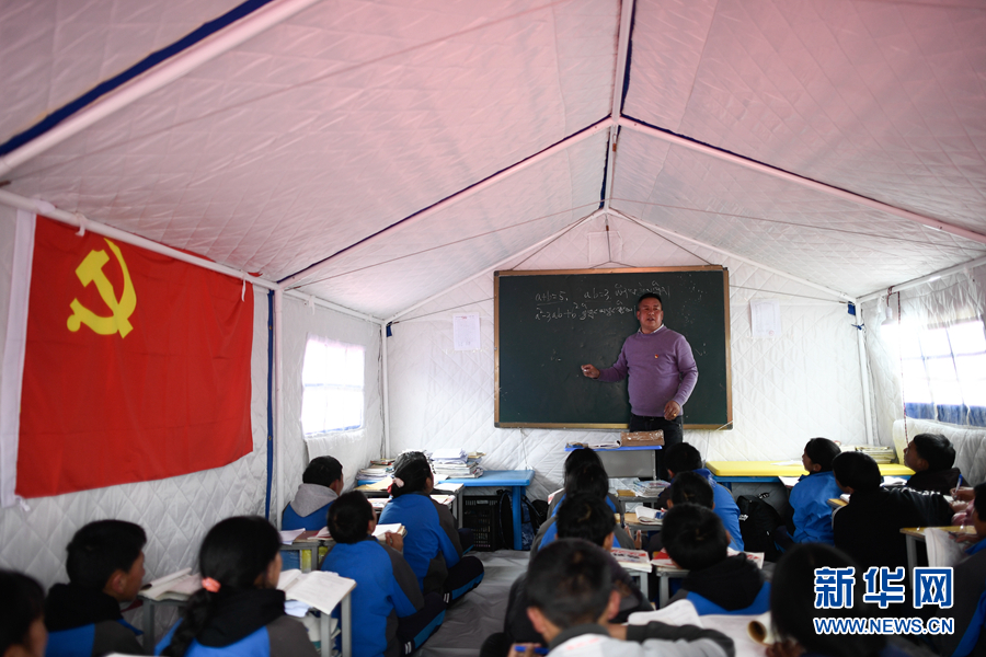 5月23日,李加才讓在帳篷教室里給學(xué)生輔導(dǎo)功課。新華社記者 張龍 攝